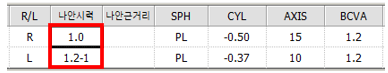 시력검사에서는 우안 1.0, 좌안 1.2가 나왔습니다. 시력표만 보면 아주 좋은 결과죠.