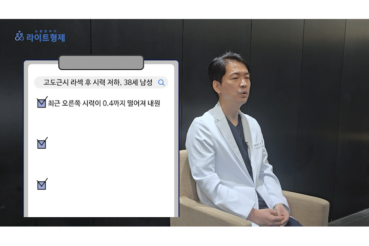 이분은 과거 고도근시 라섹 후 최근 우안 시력이 0.4까지 급락했습니다.